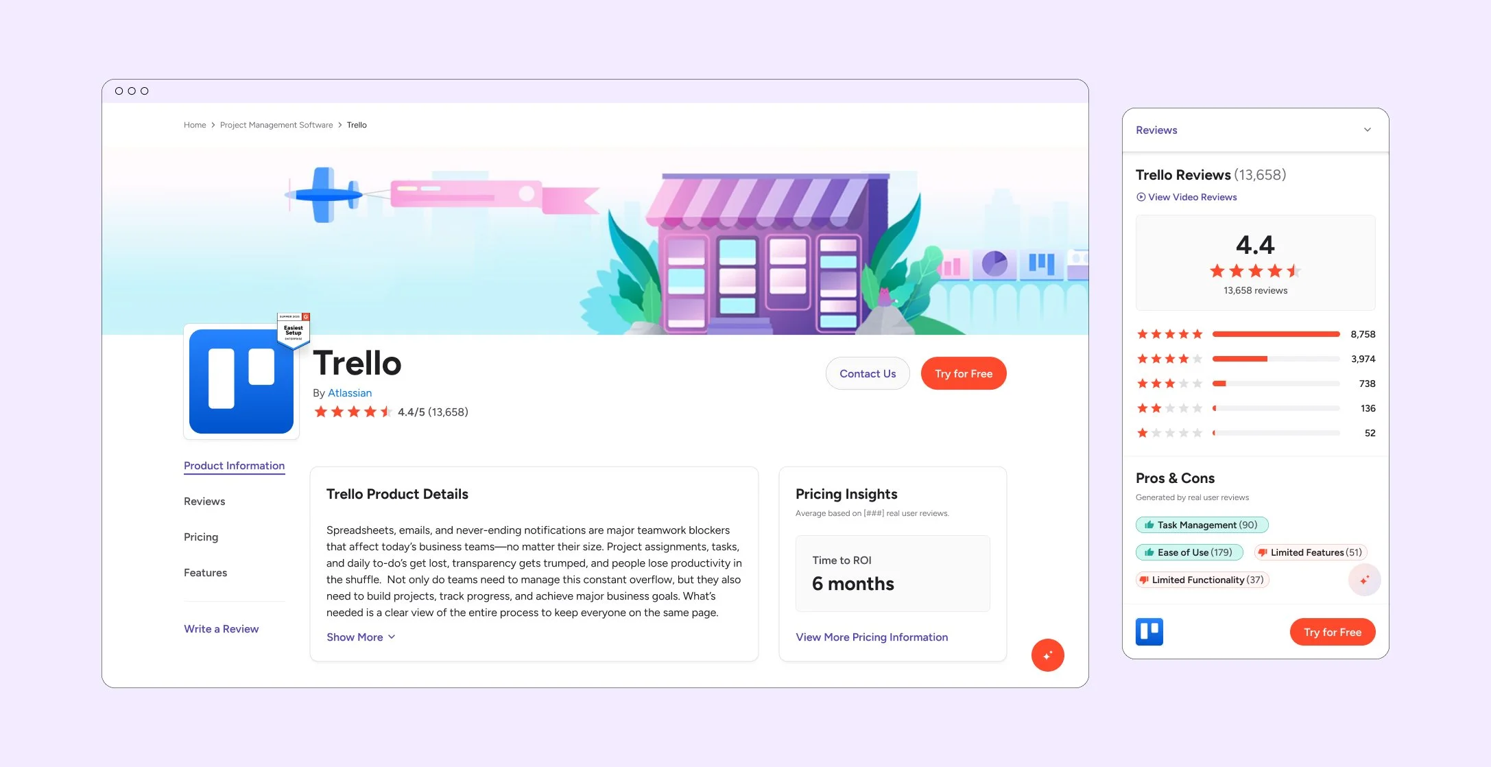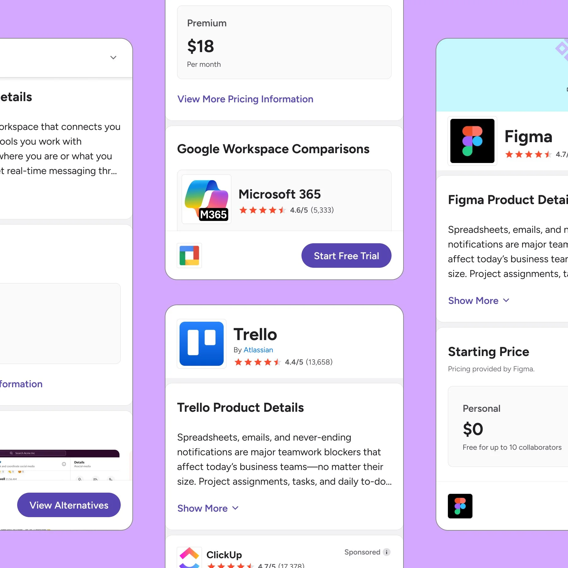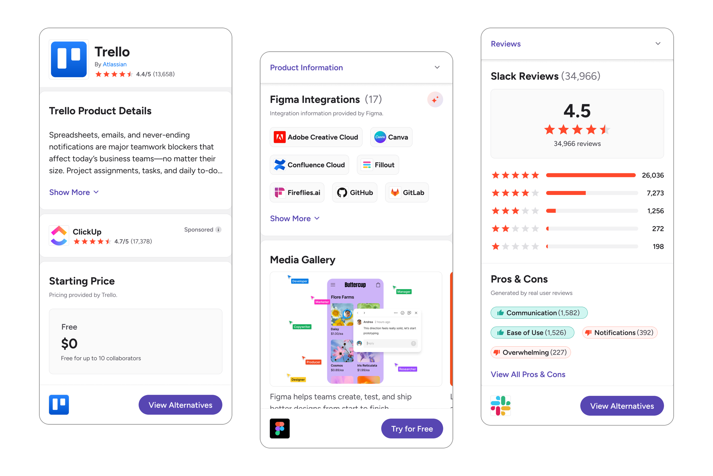 The PDP is one of G2’s most visited pages and one of the most important in a buyer’s journey. But it was cluttered, inconsistent, and difficult to navigate, especially on mobile. We set out to rebuild it to improve clarity, trust, and ultimately, conversion. What we were up against:
