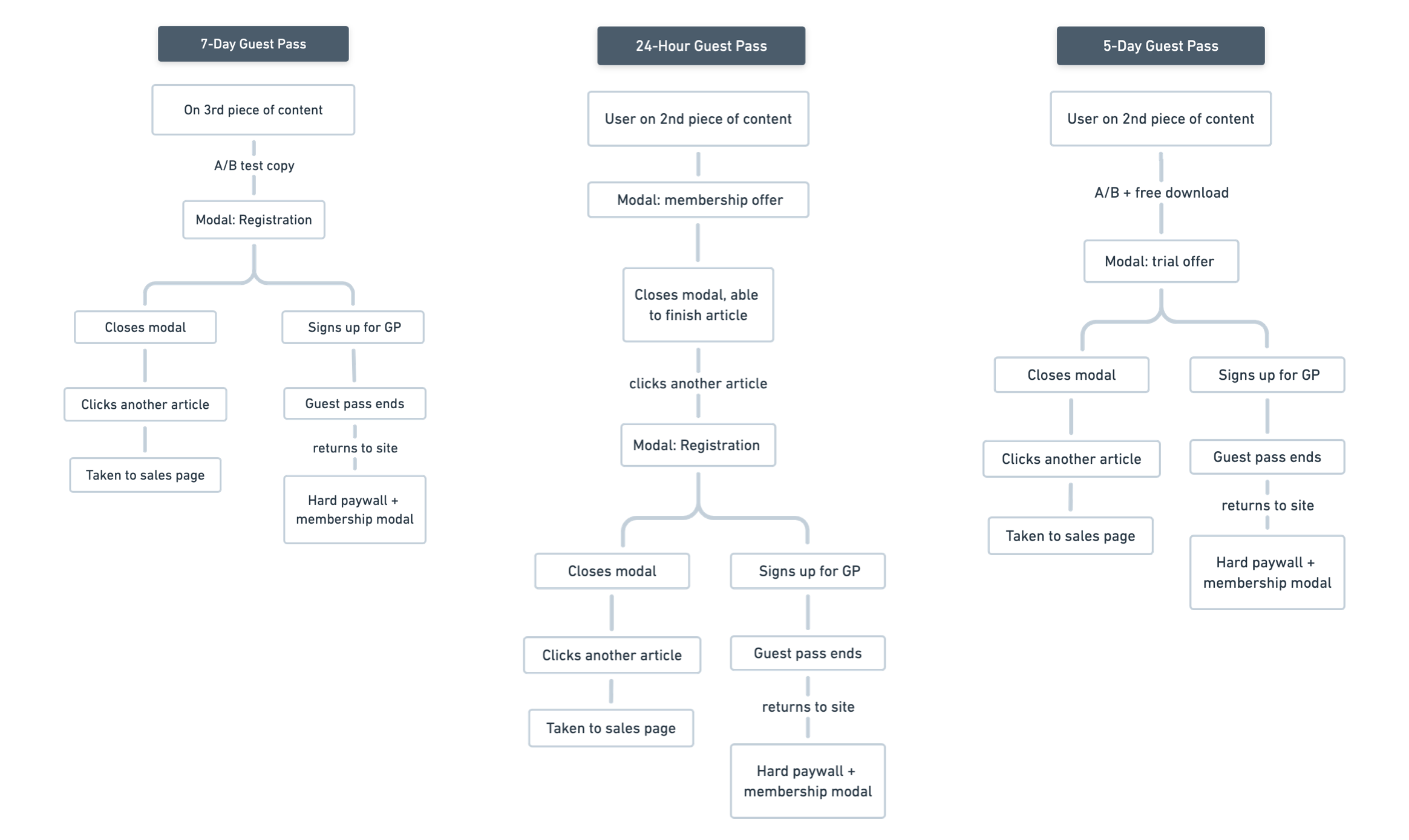 Previously, the lead capture method was a hybrid of both a metered paywall and trial memberships. New site visitors could view between one and three pieces of content before being prompted to sign up for a Guest Pass (trial).