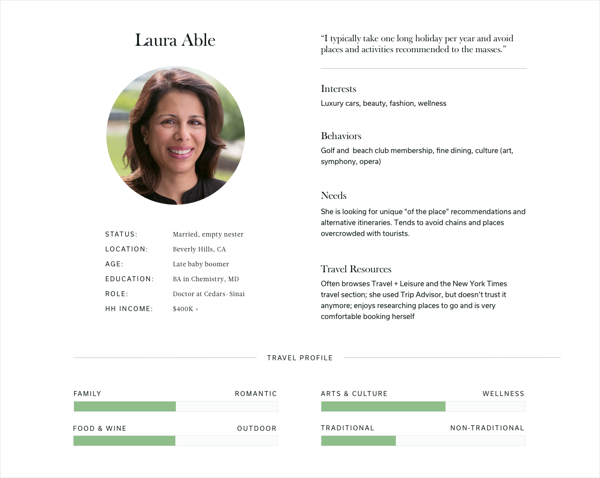 The user personas below are a semi-fictional representation of the Hideaway Report's ideal members based on market research and real data about existing members.