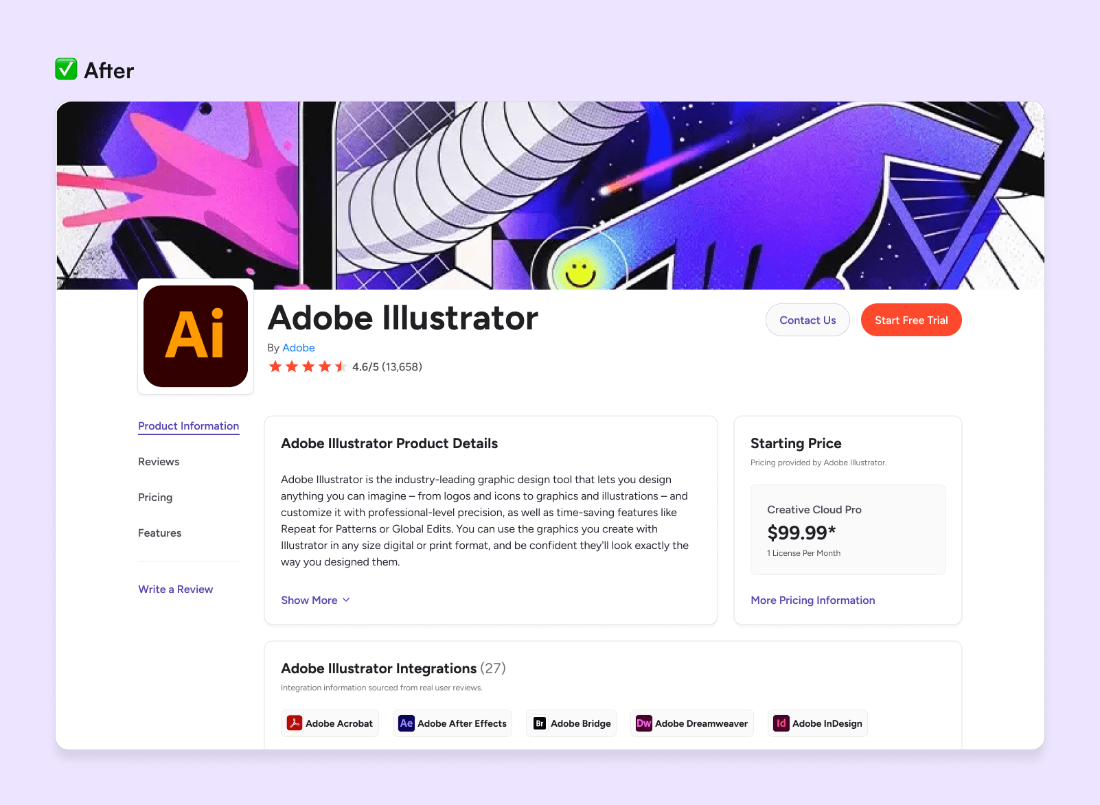 The redesign also had a broader systems impact. It introduced patterns that are being adopted across G2.com, improved accessibility, and made experimentation faster because we finally had a clean, consistent baseline.