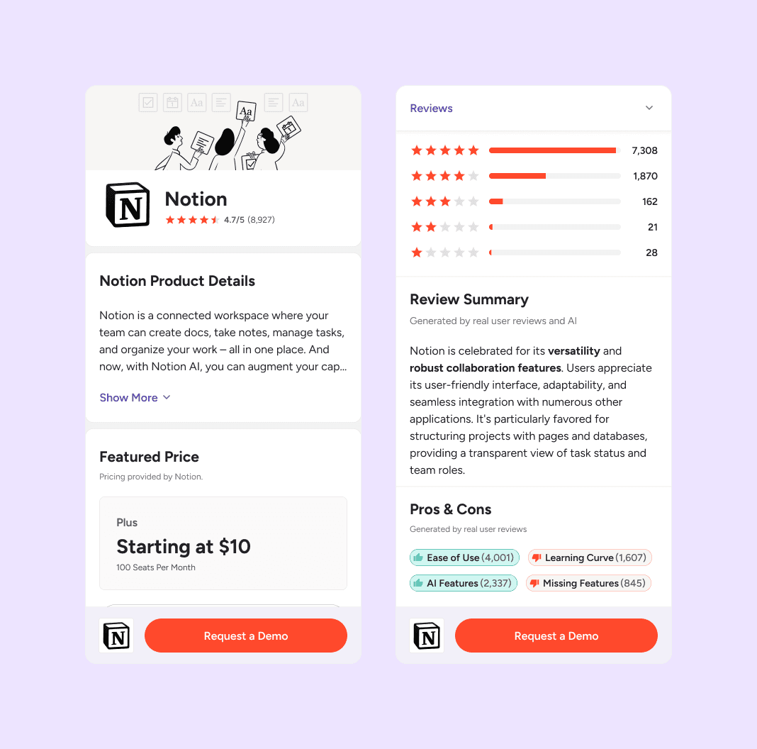 PDPs aren’t a single static template. They must work across multiple vendor tiers with very different levels of control. Paid vendors can customize banners, CTAs, integrations, and respond to reviews. Most vendors, however, are freemium, with only product images and descriptions.